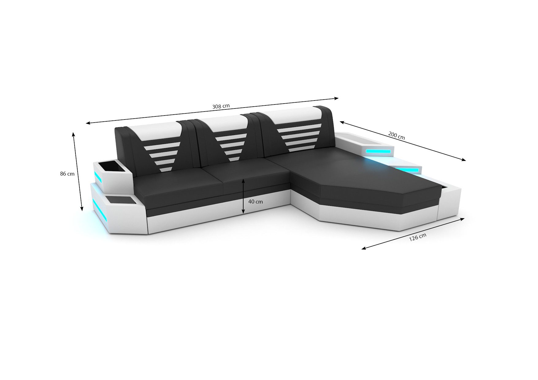 Narożnik świetnie sprawdzi się w salonie lub pokoju dziennym. Nowoczesne oświetlenie LED nadaje wnętrzu wyjątkowego klimatu, a funkcja spania zapewnia dodatkowe miejsce do noclegu.