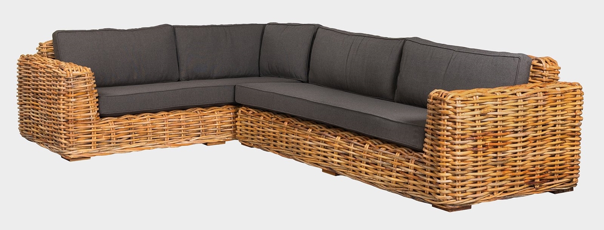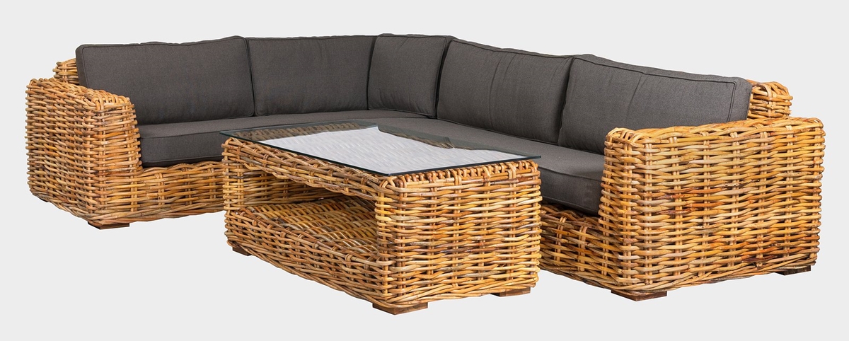 Konstrukcja mebla wykonana jest z wytrzymałego, naturalnego rattanu o grubości 30 mm, co zapewnia wysoką stabilność, nośność i długą żywotność całego zestawu. Nogi siedziska wykonane są z litego drewna tekowego, co nadaje meblowi luksusowy wygląd i zwiększa jego trwałość.