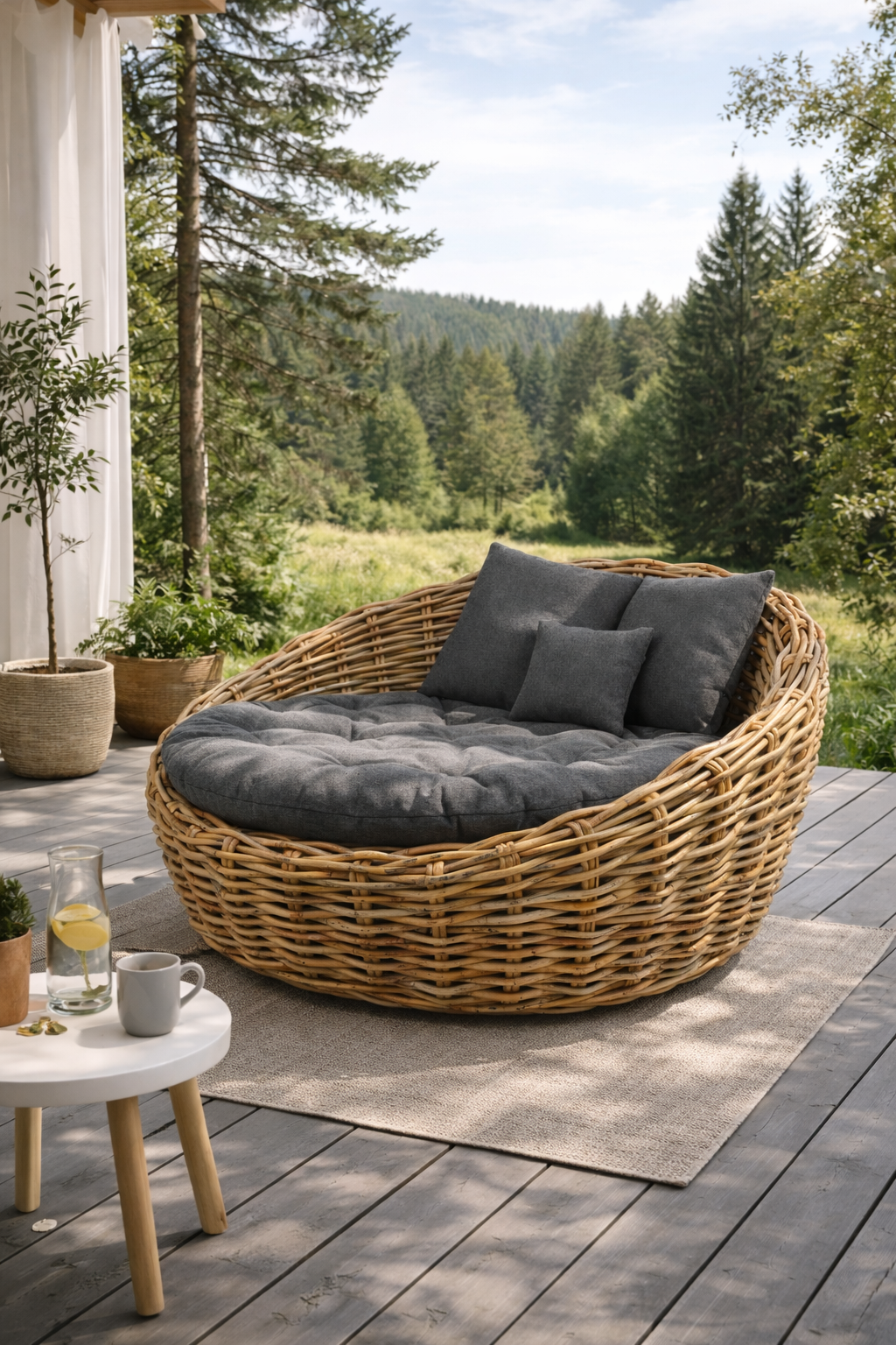 Naturalny rattan jest odporny na normalne warunki atmosferyczne i mróz. Długotrwałe narażenie na bezpośrednie działanie promieni słonecznych i deszczu spowoduje naturalne szarzenie materiału, co jest typową cechą naturalnego rattanu i nie wpływa na jego wytrzymałość ani funkcjonalność. Aby zachować jego oryginalny kolor, zalecamy umieszczenie papasanu co najmniej pod solidnym dachem.