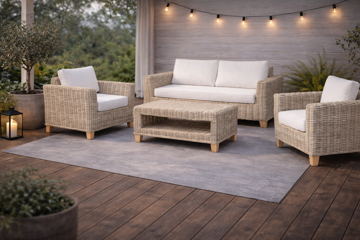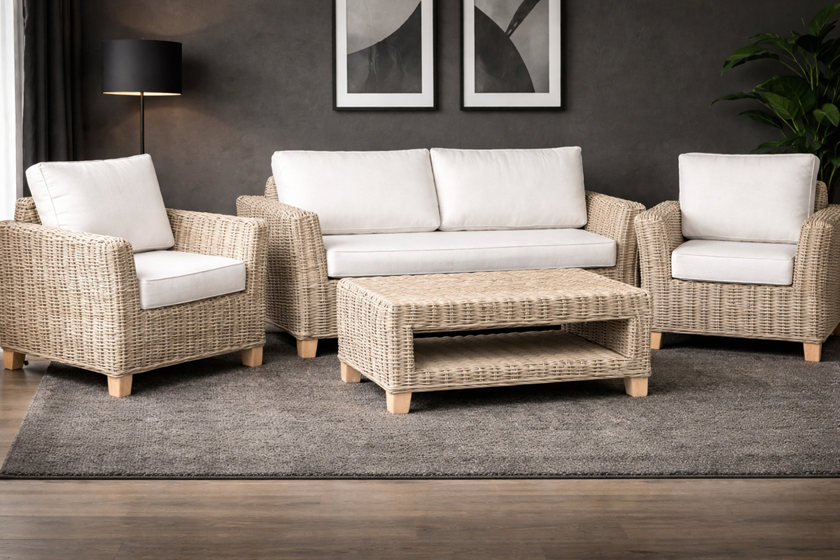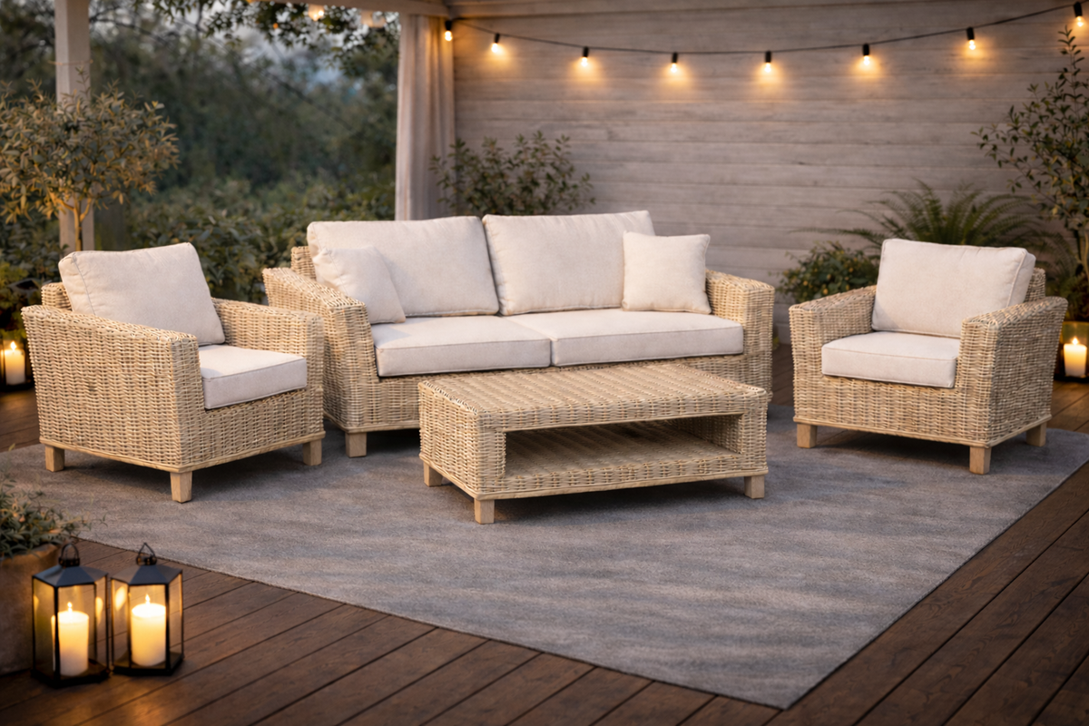 Ratan, z którego wykonano kostkę, jest pozostawiony w stanie naturalnym, nie wymaga konserwacji i jest odporny na typowe warunki atmosferyczne i mróz. Przy długotrwałym narażeniu na bezpośrednie działanie promieni słonecznych i deszczu materiał może naturalnie zszarzeć, co jest typową właściwością naturalnego rattanu i nie wpływa na jego wytrzymałość ani funkcjonalność. Aby zachować oryginalny kolor i długotrwały wygląd, zalecamy umieszczenie zestawu co najmniej pod solidnym dachem. Zimowe przechowywanie na zewnątrz jest możliwe, jeśli mebel nie będzie narażony na niekorzystne warunki atmosferyczne.