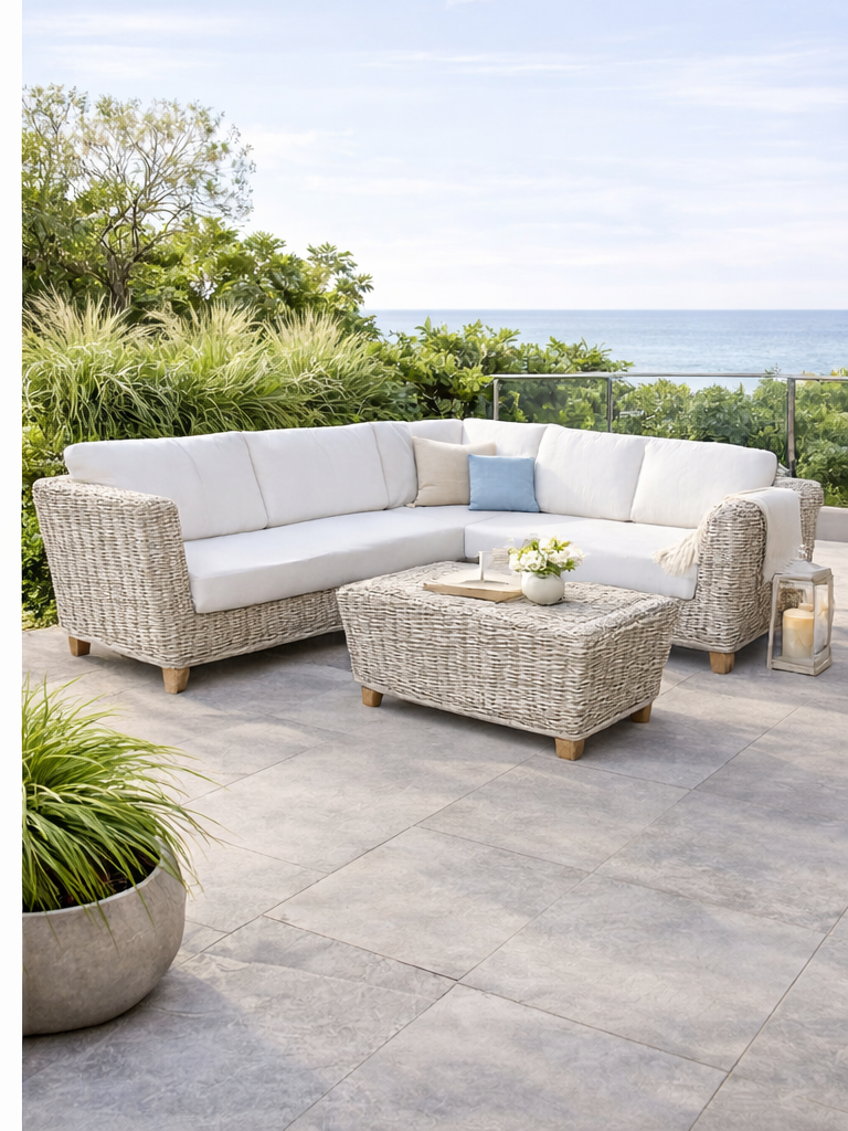 Naturalny rattan CUBU jest odporny na typowe warunki atmosferyczne i mróz. Przy długotrwałym narażeniu na bezpośrednie działanie promieni słonecznych i deszczu materiał może lekko zszarzeć, co jest naturalną właściwością rattanu i nie wpływa na jego wytrzymałość ani funkcjonalność. Aby zachować spójność koloru i długą żywotność, zalecamy umieszczenie zestawu co najmniej pod solidnym dachem. Zimowe przechowywanie na zewnątrz jest możliwe, jeśli meble nie będą narażone na niekorzystne warunki atmosferyczne.