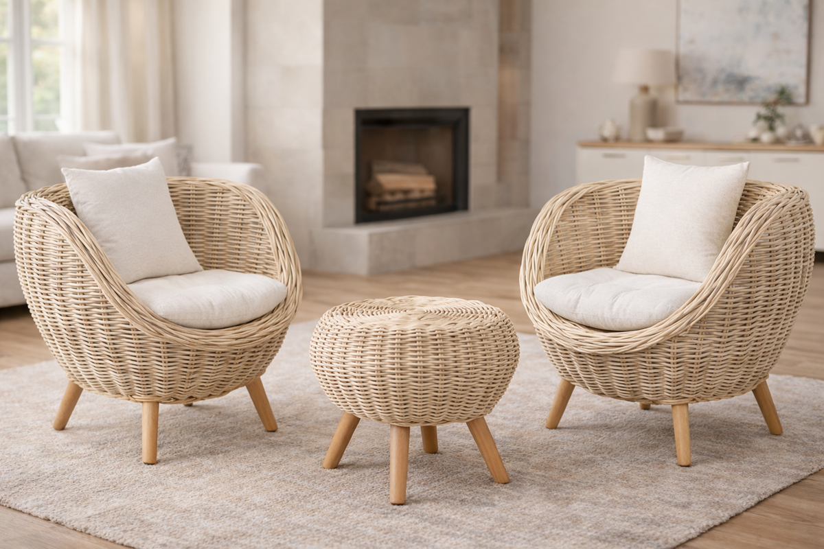 Zestaw ogrodowy PENIDA wykonany jest z najwyższej jakości naturalnego, ciętego rattanu Cubu, który charakteryzuje się wysoką wytrzymałością, elastycznością i długą żywotnością. Rattan pozostawiony jest w stanie naturalnym, bez obróbki powierzchniowej, i nadaje się do długotrwałego użytkowania na tarasach, w ogrodach i na zadaszonych terenach zewnętrznych. Stelaż krzeseł wykonany jest z wytrzymałego rattanu, dzięki czemu zestaw wytrzymuje większe obciążenia i zapewnia stabilne i bezpieczne siedzenie.